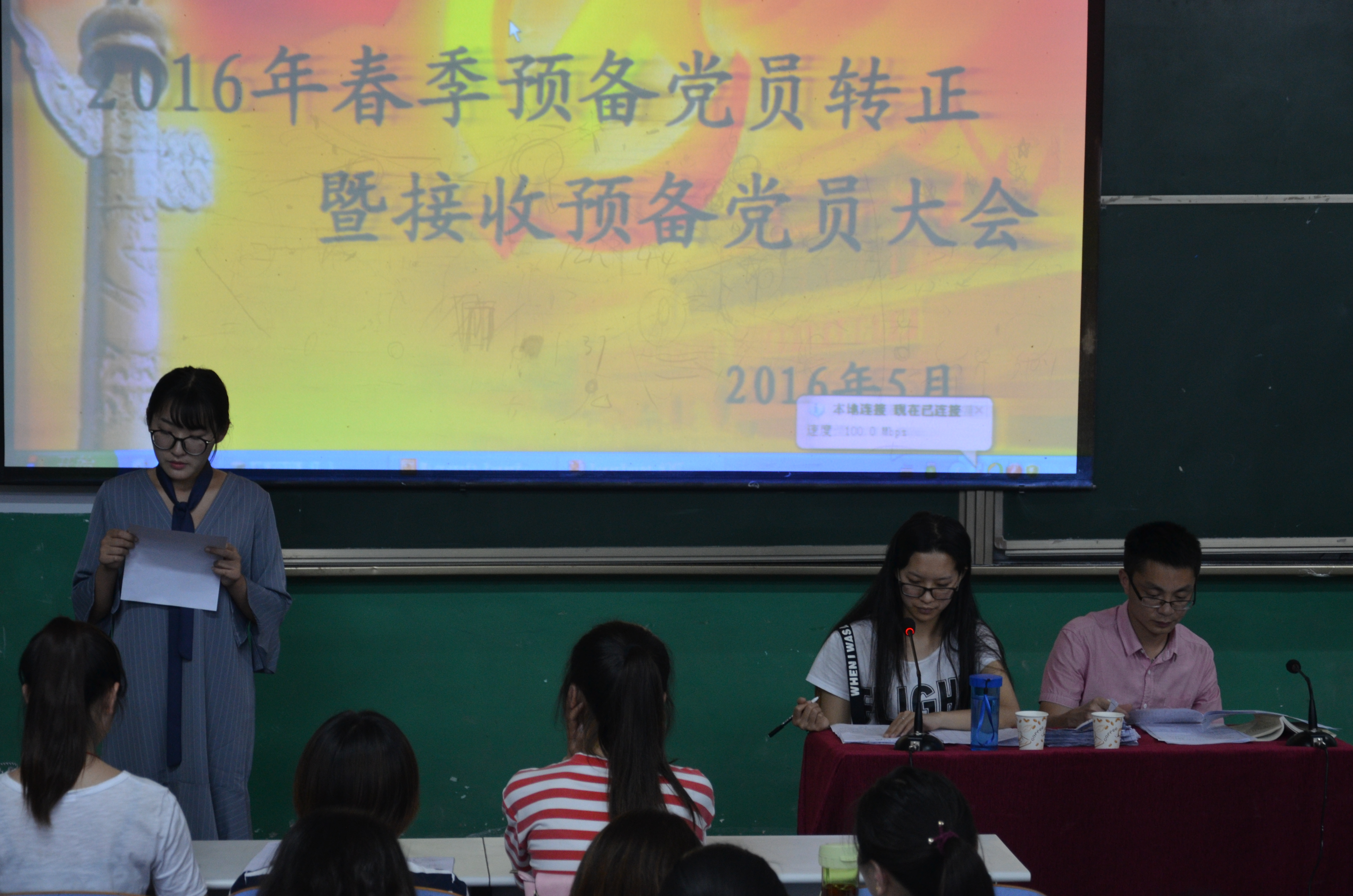 大会首先进行预备党员转正会,8名提交转正申请的预备党员宣读了转正申请、党支部首先听取了党小组意见以及其他党员和群众的意见汇报,随后宣布对预备党员的审查结果,接着支部大会展开了讨论,最后进行无记名投票表决,一致通过白茹霞等8名预备党员按期转正。随后进行接收预备党员会议,由杜书贤等7名发展对象分别汇报了对党的认识、入党动机、本人履历、家庭和主要社会关系情况,以及需向党组织说明的问题;入党介绍人介绍发展对象有关情况,并对其能否入党表明意见;支部委员会报告对发展对象的审查情况;与会党员对发展对象能否入党逐个进行了讨论,并分别采取无记名投票方式进行表决,最后一致通过接受杜书贤等7名同志为中共预备党员,拟报上级党委审批。大会在党员的庄严宣誓中结束。