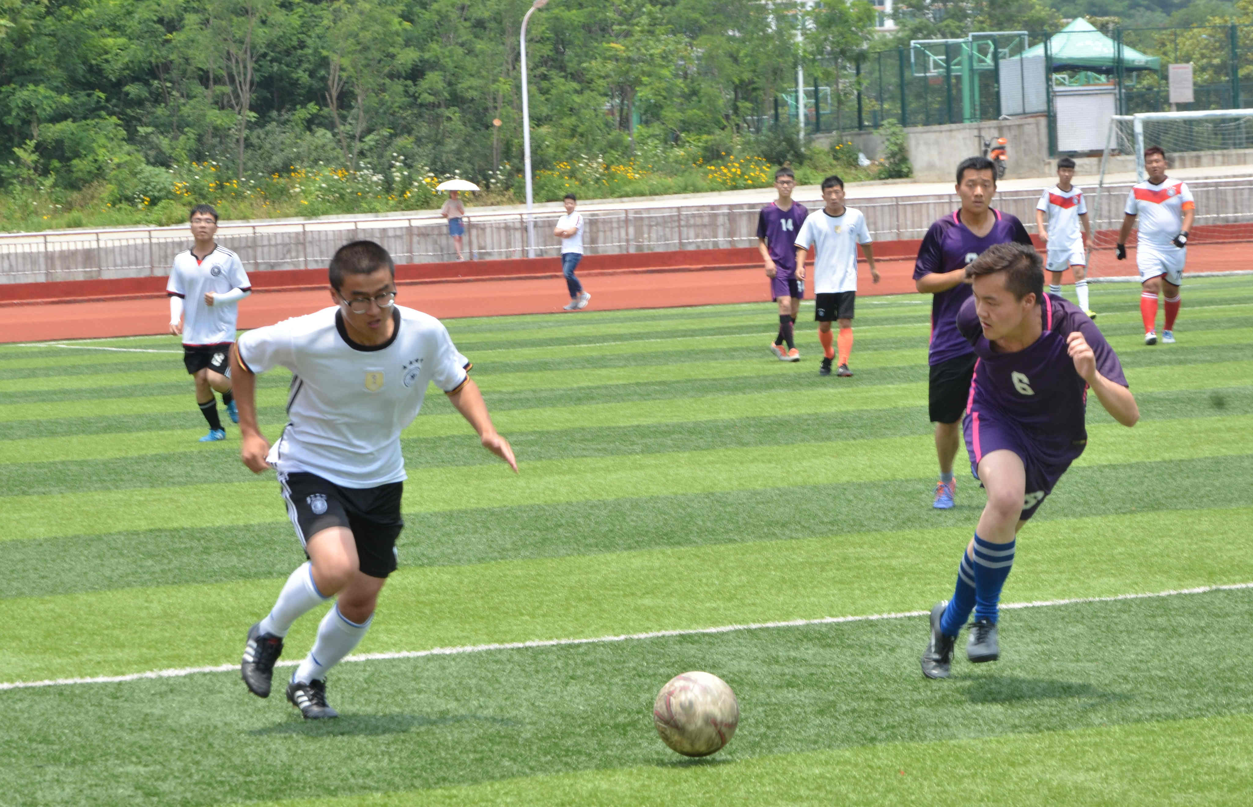 随着裁判的一声哨响,比赛正式拉开序幕。数学与统计学院队率先发起猛攻,企图以压迫性的进攻夺得赛场主动权。地理学院队临危不乱,积极回防,以默契的团队配合,严密的阵形站位,阻断了数学与统计学院队的多次进攻,并在防守之余发起反攻。双方球员于赛场上你争我夺,互不相让。绿茵场上奔跑的身影,攻防间的不断变换,将比赛推向了高潮。几番争夺过后,数学与统计学院队由于前锋脱节,阵型出现混乱。地理学院队0号球员抓住机会,突入敌方后卫防区,在队友远距离传球配合下,一脚射门,打破双方僵持局面,赢得场外观众的欢呼呐喊。至上半场结束,地理学院以1:0的比分领先。下半场,数学与统计学院队不甘落后,发起更为迅猛的反扑,想要扳回比分。地理学院队沉着应对,攻守得当,并未给数学与统计学院队留下翻盘机会。最终,地理学院获得了比赛胜利。