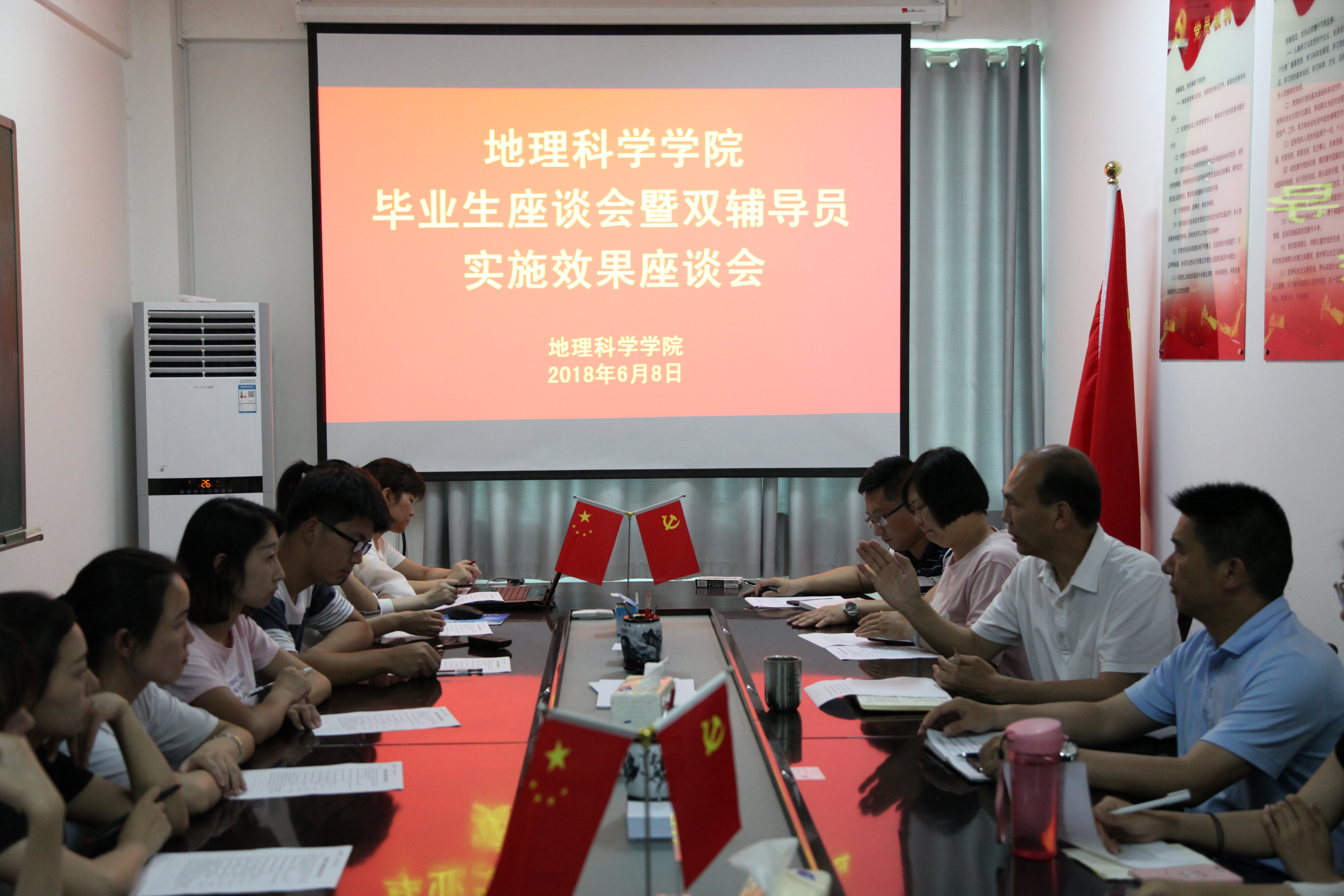 本次座谈会分为问卷调查和现场交流两个环节。在毕业生代表完成双辅导员制度实施情况调查问卷后,座谈会正式开始。各位毕业生代表结合自身学习经历积极发言,针对双辅导员制度及教学工作建言献策。其中,14级地科二班贾林巧指出教学设备较为落后,希望能够及时更新教学设备;在学习和生活上,希望专业辅导员和德育辅导员分别从考研经验分享和心理辅导两方面给予必要的帮助。14级人文班宋建龙结合自身实习经历,提出应该增加联合实习次数,提升专业知识层次,进而促进实践性人才的培养和实践教学工作的发展。与会领导老师认真聆听并一一回应了毕业生代表们所提出的问题。朱书记强调了双辅导员制度在本科教学环节中的必要性和积极作用,肯定了毕业生代表们所提出的建议。最后,吴书记作总结性发言,对大家所提出的建议表示感谢,学院将根据大家的建议逐步改进教学工作、完善双辅导员制度,并对各位毕业生提出了殷切希望。