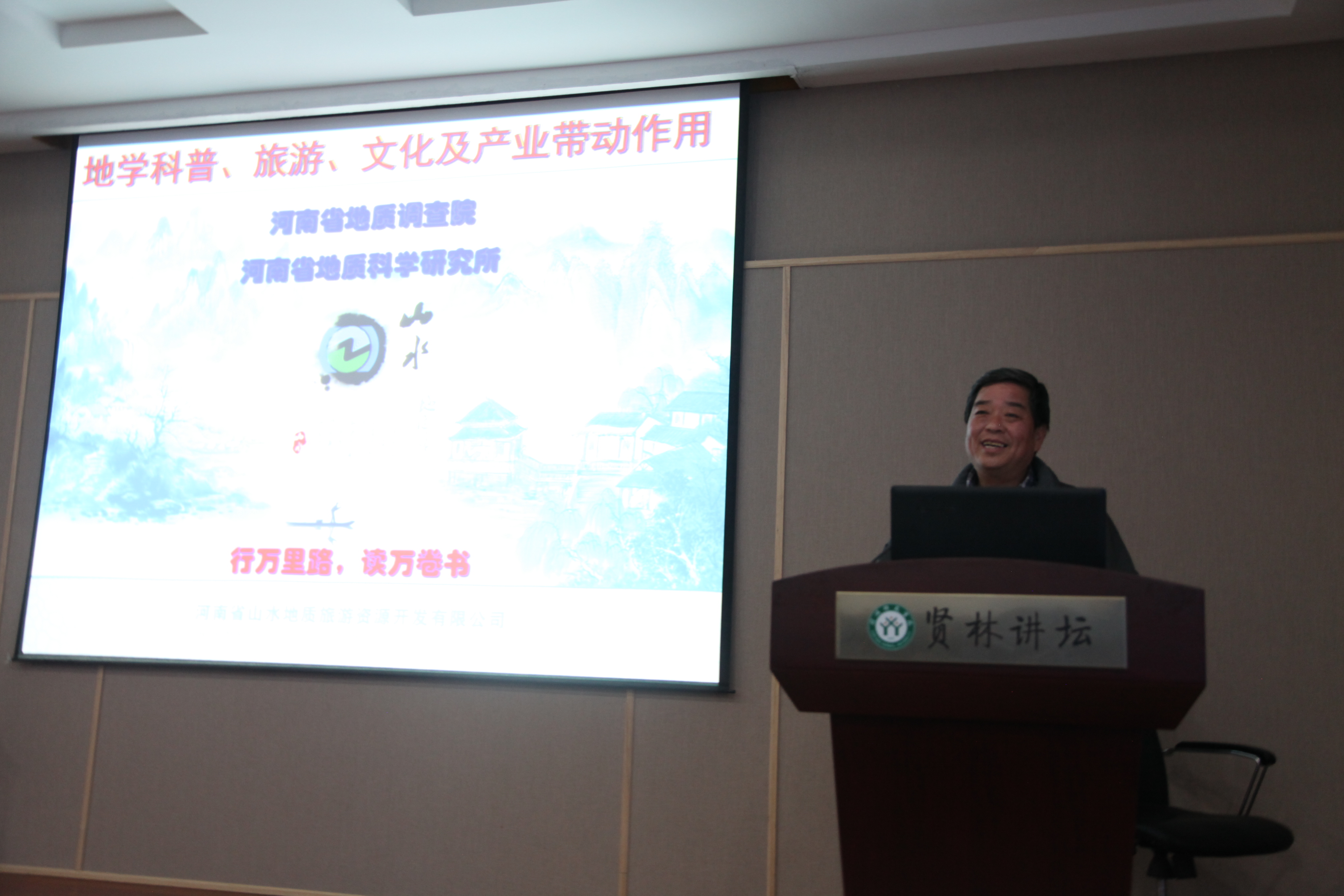 活动最后,中国国家地质公园专家库成员,中国旅游地学专家库成员,中国地质学会旅游地学与地质公园研究会副秘书长张忠慧教授,为参与此次活动的百余名大学生做了主题为“行万里路,读万卷书”的报告。他在报告中对地学科普的热潮助推了旅游发展、地质公园进入到精细化管理阶段、地学科普地学旅游及地学文化、地学旅游及文化的产业带动作用这四个方面深入浅出的解释了地学科普、旅游、文化及产业带动作用。他还多次结合自身实际经验,通过实例为同学们进行讲解地学文化的博大精深以及发展前景,并对地学科普工作提出了良好的解决方案,让与会的专家老师及在座学生都受益匪浅。