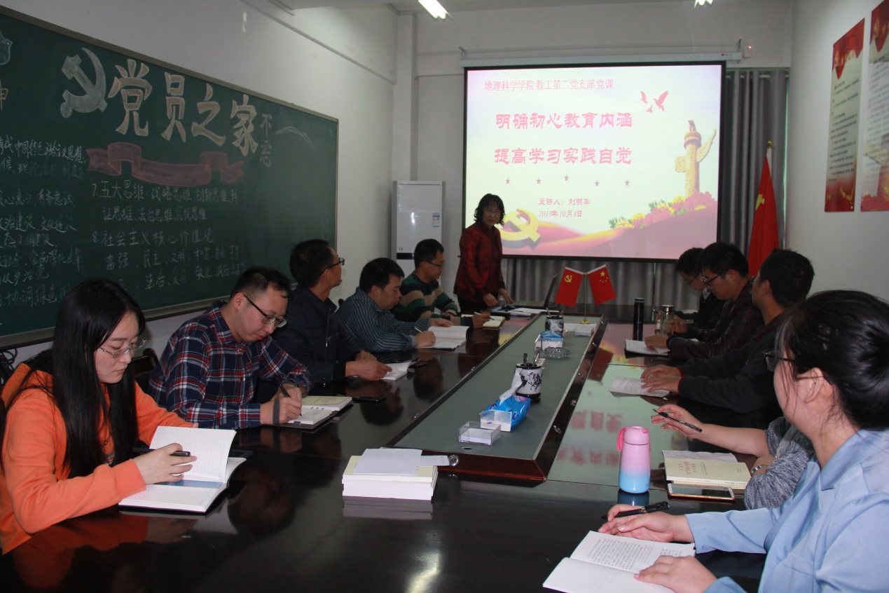 为深入学习习近平关于“不忘初心、牢记使命”论述,落实“三会一课”制度、加强党员教育管理,促进党员生活常态化。10月8日,信阳师范学院304am永利集团官网副院长刘明华同志在理科楼南楼403会议室为教职工第二党支部全体党员同志做了题为“明确初心教育内涵 提高学习实践自觉”的主题授课,全体在校党员13人参加,党课由党支部代理书记闫军辉主持。